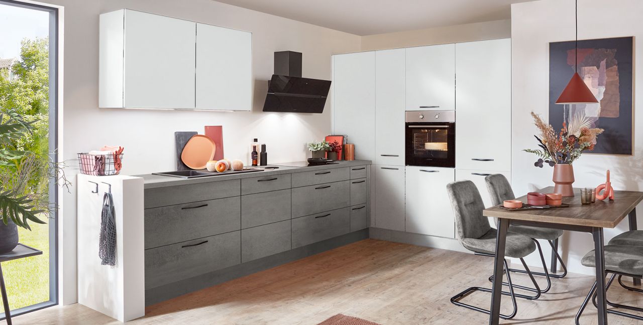 Inklusive Einbaubackofen Laurus LEB10BK Energieeffizienzklasse A, Glaskeramik Kochfeld Laurus LCA600, Designesse Edelstahl / Schwarzglas Elica WISE90BK Energieeffizienzklasse B, Kühlschrank Laurus LKG88E Energieeffizienzklasse E, Einbau-Designspüle Elleci Logik 300, Unterschränken mit Frontauszügen.